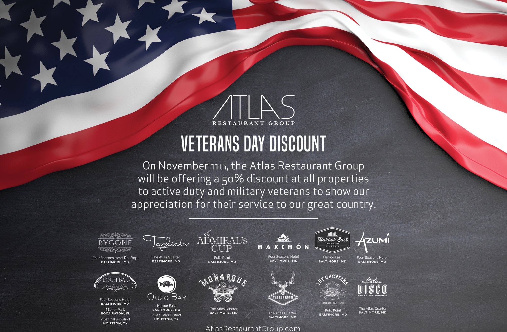 Atlas Restaurant Group On Twitter To Show Our Appreciation For Their Sacrifices And Service To Our Great Country All Active Duty And Military Veterans Will Receive A 50 Discount At All Atlas